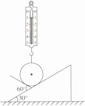 3. [河北 2024·5,4分]如图,弹簧测力计下端挂有一质量为0.20 kg的光滑均匀球体,球体静止于带有固定挡板的斜面上,斜面倾角为30°,挡板与斜面夹角为60°. 若弹簧测力计位于竖直方向,读数为1.0 N,g取10 m/s²,挡板对球体支持力的大小为