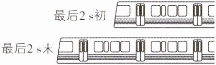 5. [浙江丽水五校2025届联考]地铁刹车后匀减速进站,晓燕同学利用照相机拍下了地铁停下前最后$2\ s$初和最后$2\ s$末的照片,如图所示. 已知地铁相邻两车门之间的距离为$4.5\ m$,地铁刹车前的速度大小为$15\ m/s$,则地铁刹车后行驶的路程为 ( )