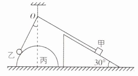 13. [江西抚州2025届联考]如图所示,倾角为30°的斜面体固定在水平面上,一横截面半径为R的半圆柱体丙放在水平面上,可视为质点的光滑小球乙的质量为m = 1 kg,用轻绳拴接置于半圆柱体上;物块甲用轻绳拴接放在斜面体上且轻绳与斜面平行,拴接小球乙与拴接物块甲的轻绳与竖直的轻绳系于O点,且O点位于半圆柱体圆心的正上方. 已知O点到水平面的高度为2R,拴接小球乙的轻绳长度为$\sqrt{3}R$,物块甲与斜面间的动摩擦因数μ = $\frac{\sqrt{3}}{4}$,整个装置始终处于静止状态. 取重力加速度g = 10 m/s²,最大静摩擦力等于滑动摩擦力. 求:(结果可用分式、根式表示)