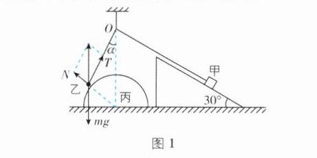 (1)对小球乙受力分析如答图1所示,由相似三角形得$\frac{mg}{2R}=\frac{N}{R}=\frac{T}{\sqrt{3}R}$,解得拴接小球乙的轻绳拉力大小为$T = 5\sqrt{3}N$。