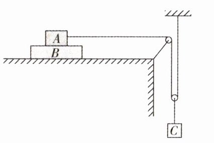 4. [福建福州一中2025届质检]如图所示,在光滑水平面上叠放有A、B两个物体,它们的质量分别为2m、m,C物体上固连一轻质滑轮,一轻质细线绕过两滑轮后连接到固定的墙上,其中与A连接的细线水平,绕过滑轮的两细线竖直. 不考虑滑轮的摩擦,A、B间的动摩擦因数μ = 0.2,g = 10 m/s²,下列说法正确的是 ( )