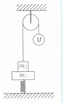 2. [河北邯郸2025届开学考](多选)如图所示,轻弹簧竖直固定在水平桌面上,质量为m₁的木块放置在弹簧上但不拴接,质量为m₂的铁块放置在木块上并通过跨过光滑定滑轮的轻质细线与质量为M的铁球连接,先用手托住铁球使细线恰好伸直但无张力,然后将铁球由静止释放. 已知重力加速度为g,M>m₂,轻弹簧劲度系数为k,轻弹簧始终处于弹性限度内,则 ( )