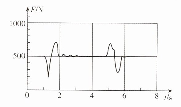 5. [江西赣州2025届期中改编]某同学在一个力传感器上进行下蹲和站起的动作,在动作过程中力传感器的示数随时间的变化情况如图所示,则该同学在超重状态下加速度的最大值约为 ( )