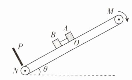 3. 如图所示,倾角$\theta = 37^{\circ}$的传送带始终以大小$v = 1.2\ m/s$的速度顺时针运行,$M$、$N$为传送带的两个端点,相距$x = 6\ m$,$N$点处有一距传送带很近的固定挡板$P$,传送带上$A$、$B$两个物块(均视为质点)用长度$L = 0.6\ m$的轻绳相连,轻绳拉直且与传送带平行,物块$A$位于$MN$的中点$O$处。现将两物块由静止释放,然后将轻绳剪断,一段时间后物块$B$与挡板$P$发生碰撞(碰撞时间极短),碰撞后物块速度大小不变、方向反向。物块$A$、$B$的质量分别为$m_{A}= 0.3\ kg$、$m_{B}= 0.1\ kg$,物块$A$、$B$与传送带间的动摩擦因数分别为$\mu_{A}= 0.8$、$\mu_{B}= 0.6$,取重力加速度大小$g = 10\ m/s^{2}$,$\sin37^{\circ}= 0.6$,$\cos37^{\circ}= 0.8$,最大静摩擦力等于滑动摩擦力。求: