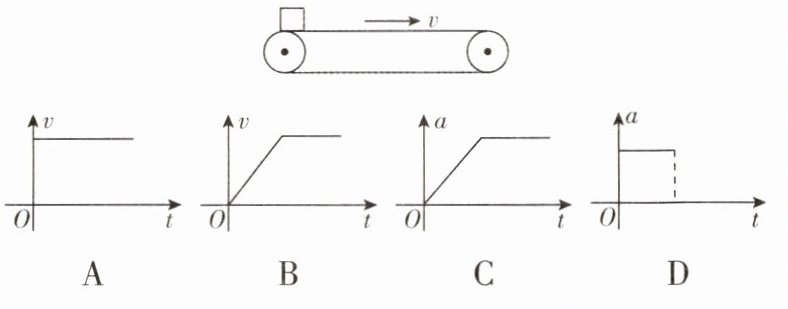1.(多选)水平传送带被广泛地应用于工厂的货物运送,如图所示为一足够长的水平传送带装置,$t = 0$时,在其左侧轻放一小物块,下列描述小物块在传送带上运动的$v - t$、$a - t$图像正确的是 ( )