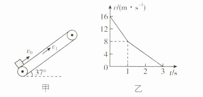 2.[海南海口农垦中学2025届月考]如图甲所示,倾斜的传送带正以恒定速率$v_{1}$沿顺时针方向转动,传送带的倾角为$37^{\circ}$。一煤块以初速度$v_{0}$从传送带的底部冲上传送带并沿传送带向上运动,其运动的$v - t$图像如图乙所示,煤块到传送带顶端时速度恰好为零,$\sin37^{\circ}= 0.6$,$\cos37^{\circ}= 0.8$。$g$取$10\ m/s^{2}$,则 ( )