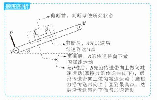 (4)剪断轻绳后,物块A受到沿传送带向上的摩擦力作用,由于 $\mu_{A}=0.8>\tan\theta = 0.75$,则物块A沿传送带由静止匀加速上滑,设加速度大小为 $a_{A}$,根据牛顿第二定律有 $\mu_{A}m_{A}g\cos\theta-m_{A}g\sin\theta=m_{A}a_{A}$,解得 $a_{A}=0.4\text{ m/s}^{2}$,从剪断轻绳到物块A与传送带达到共同速度所用的时间 $t_{A1}=\frac{v}{a_{A}}=3\text{ s}$,该过程物块A上滑的距离 $x_{A}=\frac{v}{2}\cdot t_{A1}=1.8\text{ m}<\frac{x}{2}=3\text{ m}$。物块A与传送带达到共同速度后,和传送带一起做匀速直线运动。从物块A与传送带达到共同速度时刻到物块A到达M点所用的时间 $t_{A2}=\frac{\frac{x}{2}-x_{A}}{v}=1\text{ s}$,则从剪断轻绳到物块A到达M所用的时间 $t_{A}=t_{A1}+t_{A2}=4\text{ s}$。根据匀变速直线运动的规律可知,从物块B与挡板P碰撞到物块B与传送带达到共同速度所用时间 $t_{1}=\frac{v_{B}-v}{a_{2}}=\frac{1}{9}\text{ s}$,物块B与传送带达到共同速度后到减速为零所用时间 $t_{2}=\frac{v}{a_{1}}=1\text{ s}$,由于 $t_{A}>t + t_{1}+t_{2}$,因此当物块B到达最高位置时,物块A尚未到达M点。当物块A到达M点时,物块B从最高点沿传送带下滑的距离 $s_{3}=\frac{1}{2}a_{1}(t_{A}-t - t_{1}-t_{2})^{2}\approx0.47\text{ m}$,则 $s=x - s_{B}+s_{3}\approx5.7\text{ m}$。