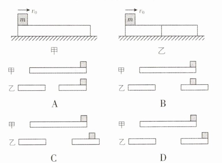5.[江苏盐城四校2025届月考]如图甲所示,木板静止在光滑水平地面上,质量为$m$的滑块以水平初速度$v_{0}$由木板左端经过时间$\Delta t$恰能滑至木板的右端与木板相对静止。若将上述木板分成长度相等的两段(如图乙所示),该滑块仍以初速度$v_{0}$从木板左端开始滑动. 也经过时间$\Delta t$,比较滑块和木板的位置关系示意图,下列正确的是( )