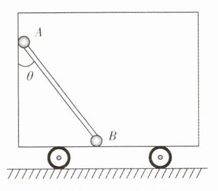 5. [湖南 2023·10,5 分](多选)如图,光滑水平地面上有一质量为 2m 的小车在水平推力 F 的作用下加速运动. 车厢内有质量均为 m 的 A、B 两小球,两球用轻杆相连,A 球靠在光滑左壁上,B 球处在车厢水平底面上,且与底面的动摩擦因数为 μ,杆与竖直方向的夹角为 θ,杆与车厢始终保持相对静止. 假设最大静摩擦力等于滑动摩擦力. 下列说法正确的是 ( )