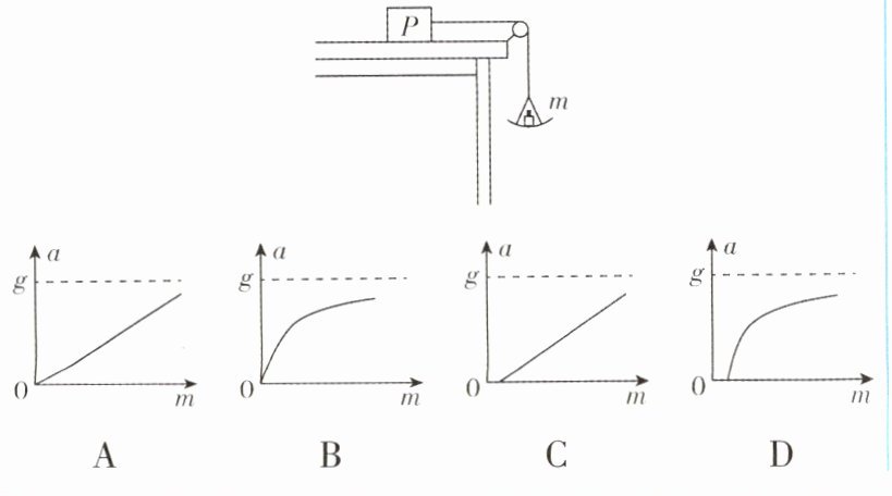 3. [全国甲 2024·15,6 分]如图,一轻绳跨过光滑定滑轮,绳的一端系物块 P,P 置于水平桌面上,与桌面间存在摩擦;绳的另一端悬挂一轻盘(质量可忽略),盘中放置砝码. 改变盘中砝码总质量 m,并测量 P 的加速度大小 a,得到 a - m 图像. 重力加速度大小为 g. 在下列 a - m 图像中,可能正确的是 ( )