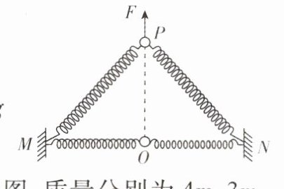 1. [安徽 2024·6,4 分]如图所示,竖直平面内有两完全相同的轻质弹簧,它们的一端分别固定于水平线上的 M、N 两点,另一端均连接在质量为 m 的小球上. 开始时,在竖直向上的拉力作用下,小球静止于 MN 连线的中点 O,弹簧处于原长. 后将小球竖直向上缓慢拉至 P 点,并保持静止,此时拉力 F 大小为 2mg. 已知重力加速度大小为 g,弹簧始终处于弹性限度内,不计空气阻力. 若撤去拉力,则小球从 P 点运动到 O 点的过程中 ( )