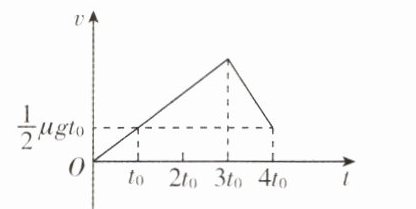 4. [黑吉辽 2024·10,6 分](多选)一足够长木板置于水平地面上,二者间的动摩擦因数为 μ. t = 0 时,木板在水平恒力作用下,由静止开始向右运动. 某时刻,一小物块以与木板等大、反向的速度从右端滑上木板. 已知 t = 0 到 t = 4t₀ 的时间内,木板速度 v 随时间 t 变化的图像如图所示,其中 g 为重力加速度大小. t = 4t₀ 时刻,小物块和木板的速度相同. 下列说法正确的是 ( )