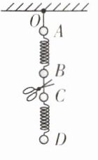 2. [湖南 2024·3,4 分]如图,质量分别为 4m、3m、2m、m 的四个小球 A、B、C、D,通过细线或轻弹簧互相连接,悬挂于 O 点,处于静止状态,重力加速度为 g. 若将 B、C 间的细线剪断,则剪断瞬间 B 和 C 的加速度大小分别为 ( )