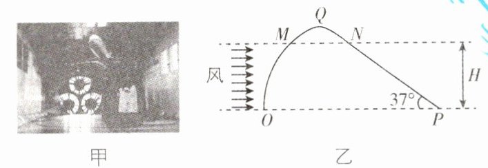 7. [福建厦门双十中学2025届月考改编]如图甲是风洞实验室全景图,风洞实验室是可量度气流对实体作用效果以及观察物理现象的一种管道状实验设备. 图乙为风洞实验室的侧视图,两水平面(虚线)之间的距离为H,其间为风洞区域,物体进入该区域会受到水平方向的恒力,自该区域下边界的O点将质量为m的小球以一定的初速度竖直上抛,从M点离开风洞区域,经过最高点Q后小球再次从N点返回风洞区域后做直线运动,落在风洞区域的下边界P处,NP与水平方向的夹角为37°,sin 37° = 0.6,cos 37° = 0.8,重力加速度为g. 求: