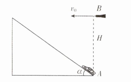 8. [山东日照2024一模]如图所示,在水平地面上固定一倾角α = 37°的斜面体,质量m = 1 kg的小车A以P = 100 W的恒定功率沿斜面底端由静止开始向上运动,同时在小车A的正上方某处,有一物块B以v₀ = 6 m/s的初速度水平抛出. 当小车A上滑到斜面上某点时恰好被物块B垂直于斜面击中. 小车A、物块B均可看作质点,小车与斜面间的动摩擦因数μ = 0.5,不计空气阻力,取重力加速度g = 10 m/s²,sin 37° = 0.6,cos 37° = 0.8. 下列判断正确的是 ( )