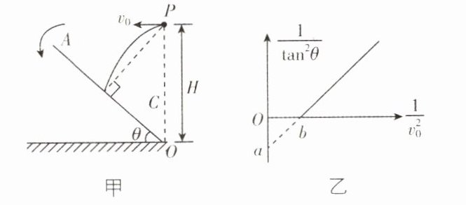 5. [湖南益阳2024三模]如图甲所示,挡板OA与水平面的夹角为θ,小球从O点的正上方高度为H的P点以速度v₀水平抛出,落到斜面时,小球的位移与斜面垂直. 让挡板绕固定的O点转动,改变挡板的倾角θ,小球平抛运动的初速度v₀也改变,每次平抛运动都使小球的位移与斜面垂直,$\frac{1}{\tan^{2}\theta}-\frac{1}{v_{0}^{2}}$关系图像如图乙所示,重力加速度g = 10 m/s²,下列说法正确的是 ( )