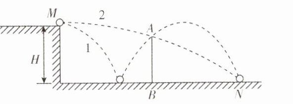 2. [安徽合肥2025届月考改编](多选)从高H处的M点先后水平抛出两个小球1和2,轨迹如图所示,球1与地面碰撞一次后刚好越过竖直挡板AB,落在水平地面上的N点,球2刚好直接越过竖直挡板AB,也落在N点. 设球1与地面的碰撞是弹性碰撞,忽略空气阻力,重力加速度为g,则下列说法正确的是 ( )