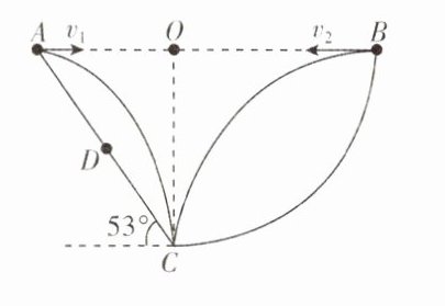 1. 如图所示,同一竖直平面内有四分之一圆弧BC和倾角为53°的斜面AC,A、B两点与圆弧BC的圆心O等高,现将甲、乙小球分别从A、B两点以初速度v₁、v₂沿水平方向同时抛出,两球恰好在C点相碰(不计空气阻力). 已知sin 53° = 0.8,cos 53° = 0.6,下列说法正确的是 ( )