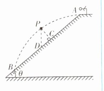 3. [河北邯郸2025届期中]如图所示,在某次跳台滑雪比赛中,运动员以初速度v₀从跳台顶端A水平飞出,经过一段时间后落在倾斜赛道上的B点,运动员运动到P点时离倾斜赛道最远,P点到赛道的垂直距离为PC,P点离赛道的竖直高度为PD,赛道的倾角为θ,重力加速度为g,空气阻力不计,运动员(包括滑雪板)视为质点. 则C、D两点间的距离是 ( )