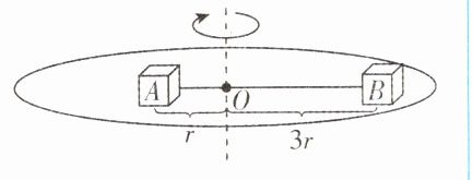 2. (多选)如图所示,在匀速转动的水平圆盘上,沿直径方向放着用轻绳相连的物体A和B(可视为质点),A和B的质量都为m. 它们分居圆心两侧,与圆心的距离分别为$R_{A}=r$,$R_{B}=3r$,A、B与盘间的动摩擦因数相同且均为$\mu$. 若最大静摩擦力等于滑动摩擦力,不计空气阻力,重力加速度为g,当圆盘转速从零开始逐渐加速到两物体刚好要发生但还未发生滑动时,下列说法正确的是( )