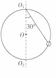 1. [山东泰安2024期中]如图所示,竖直放置一光滑的大圆环,圆心为O,半径为R. 一根轻质细绳一端固定在大圆环的最高点,另一端连接一质量为m且套在大圆环上的小圆环,静止时细绳与竖直轴之间的夹角为30°,现让大圆环绕过圆心O的竖直轴$O_{1}O_{2}$转动,从静止开始缓慢增加转动的角速度,直至小圆环将要沿着大圆环向上滑动,重力加速度为g,下列说法正确的是( )