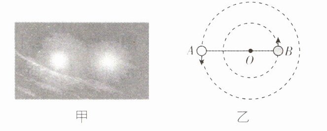 9. [云南师大附中2025届模拟]洛希极限是指在双星系统中,在两天体质量能保持稳定的情况下,它们之间的最小距离. 如果两个天体之间的距离小于洛希极限,则质量较小的天体就会在质量较大的天体引力作用下被撕碎. 洛希极限的计算公式为$r = 2.44R(\frac{M}{m})^{\frac{1}{3}}$,$M$、$m$分别为质量较大和较小的天体质量,$R$为质量较大的天体的半径. 如图甲所示,某脉冲双星系统由两颗相距较近的天体组成,并远离其他天体,它们在彼此间的万有引力作用下,绕连线上的一点做匀速圆周运动. 简化为如图乙所示,测得$A$、$B$两恒星间的距离为$L$,$A$、$B$两恒星的半径分别为$R_{A}$、$R_{B}$,恒星$A$做圆周运动的向心加速度大小是恒星$B$的$\frac{125}{64}$倍,则该双星系统的洛希极限为 ( )