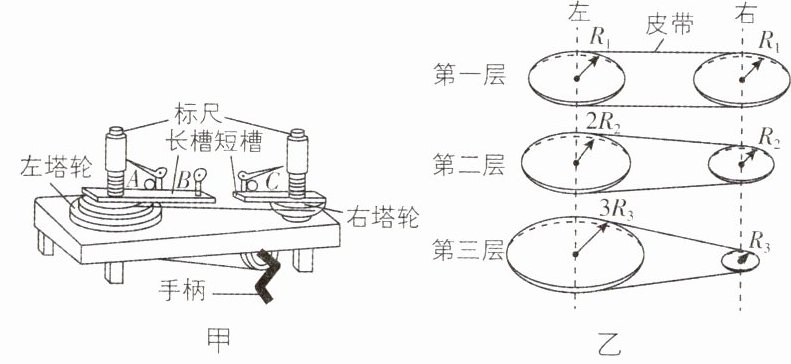 2. 某实验小组做探究影响向心力大小因素的实验:用如图甲所示的装置,已知小球在挡板A、B、C处做圆周运动的轨迹半径之比为1 : 2 : 1,变速塔轮自上而下按如图乙所示三种组合方式,左右每层半径之比由上至下分别为1 : 1、2 : 1和3 : 1. 回答以下问题: