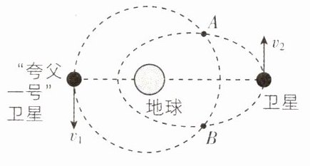3. [四川内江2024一模]2023年4月14日,我国首颗太阳探测卫星“夸父一号”准时观测了部分数据,实现了数据共享. 如图所示,“夸父一号”卫星和另一颗卫星分别沿圆轨道、椭圆轨道绕地球沿逆时针方向运动,圆轨道的半径与椭圆轨道的半长轴相等,两轨道相交于$A$、$B$两点,某时刻两卫星与地球在同一直线上,下列说法正确的是 ( )