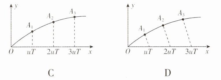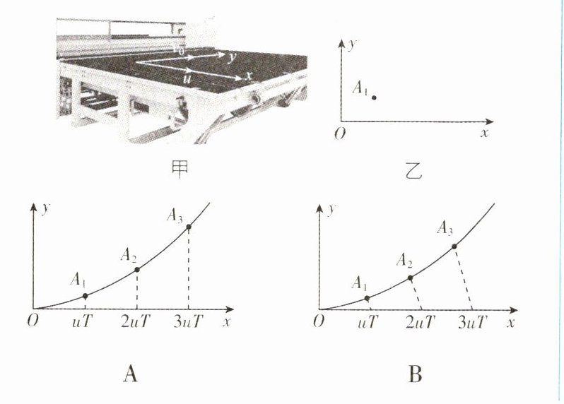 2. [安徽蚌埠2024三模]如图甲所示,某工人在流水线上切割玻璃,在水平工作台面建立平面直角坐标系$xOy$,玻璃沿$x$轴运行的速度$u$恒定不变,切割时刀头的初速度$v_0$沿$y$轴方向,运动过程中刀头相对玻璃的速度方向保持不变且速度逐渐减小,经过时间$T$刀头运动到$A_1$点,如图乙所示. 经过时间$2T$、$3T$刀头运动到$A_2$、$A_3$点,则刀头的轨迹可能是 ( )