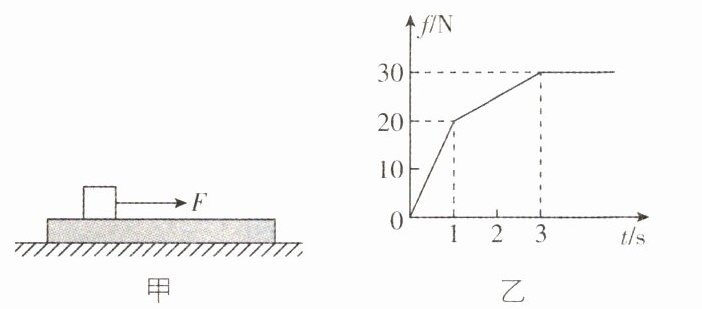 1. [湖南普通高中2024模拟]如图甲所示,在水平地板上,一个质量$m = 5\text{ kg}$的铁块放在长木板上,如果给铁块施加从零开始逐渐增大的水平力$F = kt$(式中$k\neq0$),铁块与长木板之间的摩擦力随时间的变化规律如图乙所示. 已知最大静摩擦力等于滑动摩擦力,$g$取$10\text{ m/s}^2$,结合图中数据,下列说法正确的是 ( )
