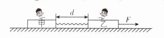 5. [山东2024·7,3分]如图所示,质量均为m的甲、乙两同学,分别坐在水平放置的轻木板上,木板通过一根原长为l的轻质弹性绳连接,连接点等高且间距为d(d<l).两木板与地面间动摩擦因数均为μ,弹性绳劲度系数为k,被拉伸时弹性势能$E=\frac{1}{2}kx^{2}$(x为绳的伸长量).现用水平力F缓慢拉动乙所坐木板,直至甲所坐木板刚要离开原位置,此过程中两人与所坐木板保持相对静止,k保持不变,最大静摩擦力等于滑动摩擦力,重力加速度大小为g,则F所做的功等于( )