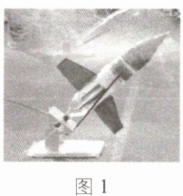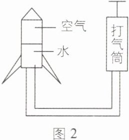 6. [重庆2024调研]如图1所示,水火箭又称气压式喷水火箭、水推进火箭,由饮料瓶、硬纸片等环保废旧材料制作而成. 图2是水火箭的简易原理图:用打气筒向水火箭内不断打气,当内部气体压强增大到一定程度时发射,发射时可近似认为水从水火箭中向下以恒定速度$v_0 = 40\ m/s$在不到0.1 s时间内喷完,使水火箭升空. 已知水和水火箭的质量分别为$m_1 = 0.4\ kg$、$m_2 = 0.3\ kg$,忽略空气阻力,水刚好喷完时,水火箭的速度最接近 ( )