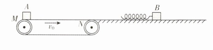 5. [辽宁丹东2024一模]如图所示,传送带与足够长的光滑水平地面平滑连接,滑块$A$与传送带之间的动摩擦因数为$\mu = 0.2$,传送带两轮之间的距离为$L = 2\ m$,传送带以速率$v_0 = 2\ m/s$顺时针匀速转动. 滑块$B$的左端连接一轻弹簧,弹簧保持水平. 滑块$A$从传送带左端$M$点由静止释放,与静止在水平地面上的滑块$B$通过弹簧发生弹性正碰. 已知两滑块$A$、$B$的质量分别为1 kg和4 kg,且均可视为质点,重力加速度$g = 10\ m/s^2$,求: