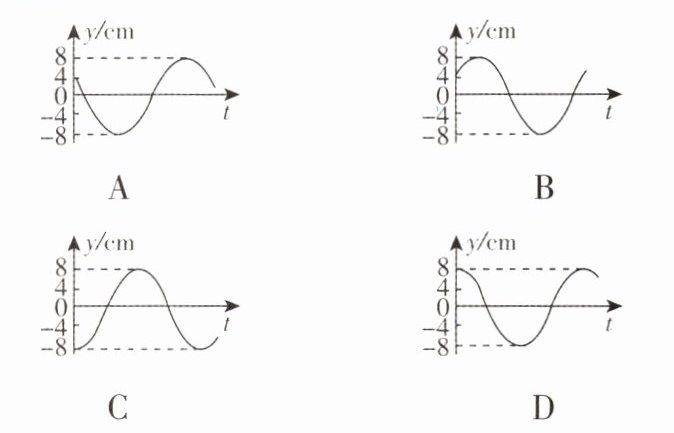 5. [湖北 2023·7,4 分]一列简谐横波沿 $x$ 轴正向传播,波长为 $100$ cm,振幅为 $8$ cm. 介质中有 $a$ 和 $b$ 两个质点,其平衡位置分别位于 $x = -\frac{40}{3}$ cm 和 $x = 120$ cm 处. 某时刻 $b$ 质点的位移为 $y = 4$ cm,且向 $y$ 轴正方向运动. 从该时刻开始计时,$a$ 质点的振动图像为 ( )