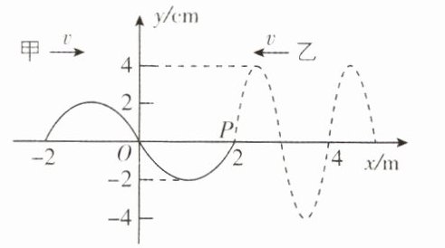 6. [山东 2024·9,4 分](多选)甲、乙两列简谐横波在同一均匀介质中沿 $x$ 轴相向传播,波速均为 $2$ m/s. $t = 0$ 时刻二者在 $x = 2$ m 处相遇,波形图如图所示. 关于平衡位置在 $x = 2$ m 处的质点 $P$,下列说法正确的是 ( )