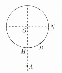 4.[河南安阳2025届一模](多选)如图所示,在竖直空间固定半径为$R$的绝缘圆环,圆环圆心$O$点正下方距圆环一定距离处有一带正电小球$A$,圆环上套有一带正电小球$B$,初始时$B$静止在圆环上$M$点的右侧. 现用外力使$A$缓慢向圆环最低点$M$移动,则$B$沿圆环右移,在此过程中,两小球所带电荷量保持不变且可视为点电荷,不计一切摩擦,则下列说法中正确的是 ( )