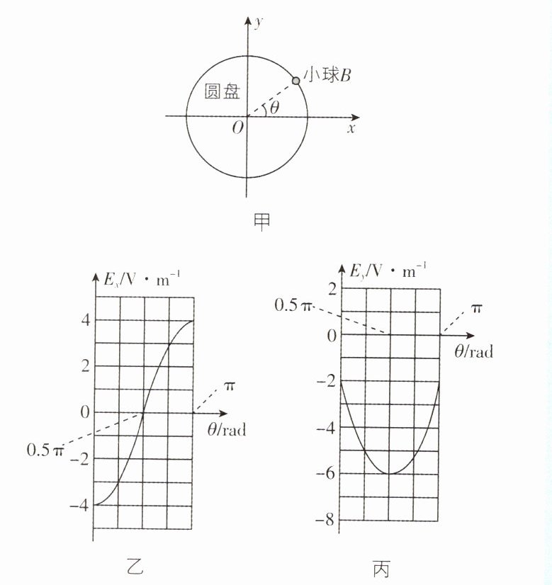4. [福建师大附中2024模拟](多选)如图甲所示,两个可看作点电荷的带电绝缘小球均紧靠在塑料圆盘边缘,小球A固定不动(图中未画出),小球B绕圆盘边缘在平面内从θ = 0沿逆时针缓慢移动. 测量圆盘中心O处的电场强度,获得沿x方向的电场强度Eₓ随θ变化的图像(图乙)和沿y方向的电场强度Eᵧ随θ变化的图像(图丙). 下列说法正确的是 ( )