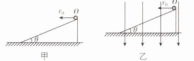 1. 如图所示,图甲中运动的小球只受重力作用,图乙中存在竖直向下的匀强电场,甲、乙两图中的斜面相同且绝缘. 现将完全相同的带负电小球从两斜面上的同一点O以相同初速度沿水平方向抛出,分别落在甲、乙图中斜面上A、B点(图中未画出). 小球受到的电场力始终小于重力,不计空气阻力. 则下列说法正确的是 ( )