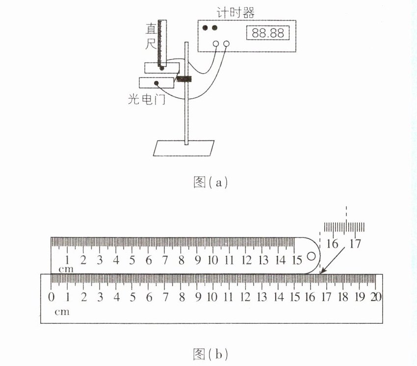 2. 某兴趣小组用光电门、计时器和直尺测量当地的重力加速度. 图(a)是其实验装置,其操作方法是:让直尺下端刚好处于光电门处并由静止释放,计时器记录直尺通过光电门的时间,直尺运动过程中尺身始终处于竖直方向,图(b)是量程分别为0~15.0 cm的钢尺和0~20.0 cm的塑料尺.