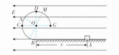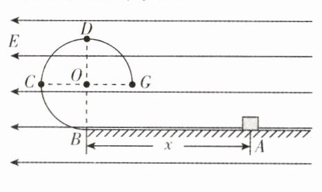 4.[湖北武汉华中师大一附中2025届期中]如图所示,BCDG是光滑绝缘的\frac{3}{4}圆形轨道,位于竖直平面内,轨道半径为R,下端与光滑水平绝缘轨道在B点平滑连接,整个轨道处在水平向左的匀强电场中.现有一质量为m、带正电的小滑块(可视为质点)置于水平轨道上,滑块受到的静电力大小为\frac{3}{4}mg(g为重力加速度).将滑块从B点右侧距离为x的A点由静止释放.
