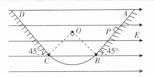 3.[四川成都2024一诊](多选)如图所示,空间存在范围足够大的匀强电场,场强大小E = \frac{mg}{q},方向水平向右.竖直面内一绝缘轨道由半径为R的\frac{1}{4}光滑圆弧\overset{\frown}{BC}与足够长的倾斜粗糙轨道AB、CD组成,AB、CD与水平面夹角均为45°且分别在B、C两点与圆弧轨道相切.带正电的滑块质量为m、电荷量为q,从AB轨道上与圆心O等高的P点以v₀ = 2\sqrt{gR}的速度沿轨道下滑.已知滑块与AB、CD轨道间的动摩擦因数μ = \frac{\sqrt{2}}{2},重力加速度大小为g.下列说法正确的是 ( )