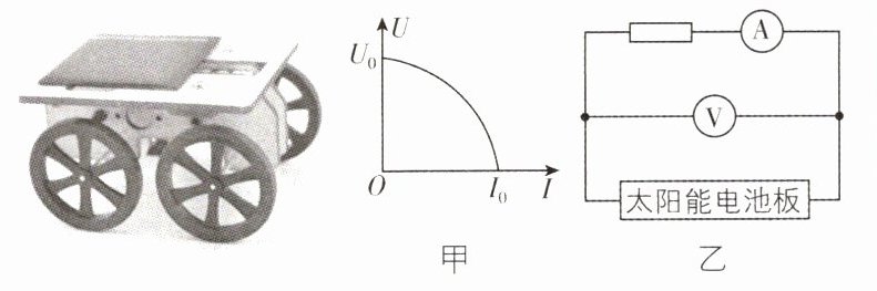 4. [四川宜宾2024模拟](多选)某同学将一玩具车的太阳能电池板取下,并通过测量电池板的路端电压U及流过其的电流I的数据描绘了电池板的$U - I$图像,如图甲所示,图像的横、纵轴截距分别为$I_{0}$和$U_{0}$. 现将该电池板与一定值电阻相连组成如图乙所示的电路,电压表和电流表的示数分别为$U_{1}$和$I_{1}$,两电表均为理想电表,下列说法正确的是 ( )