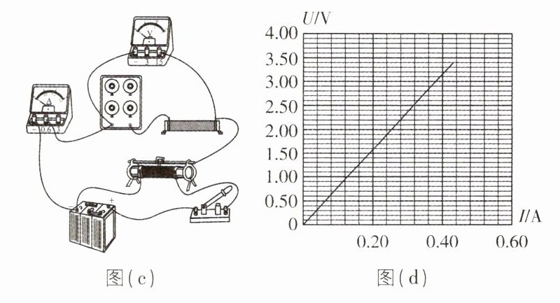 (3)闭合开关,调节滑动变阻器,读取电压表的示数U和电流表的示数I,得到多组测量数据,处理数据得到U - I图像如图(d)所示,则这段电阻丝的电阻$R_{x}$=____$\Omega$(结果保留2位有效数字).