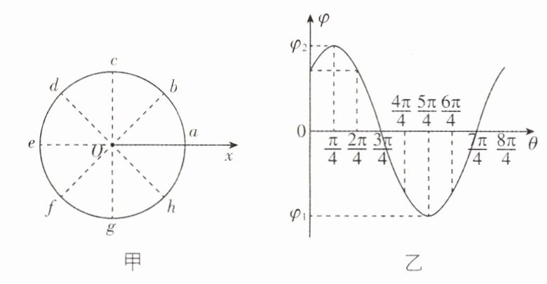 10. [广东广州2025届阶段考]为测定纸面内匀强电场的场强,在电场中取O点为坐标原点建立x轴,以O为圆心、R为半径作圆. 如图甲b、c、d是半圆ace的等分点. 从x轴上的a点开始沿逆时针方向,测量圆上各点的电势φ及各点所在半径与x轴正方向的夹角θ,描绘φ - θ图像如图乙所示,则下列说法中正确的是 ( )