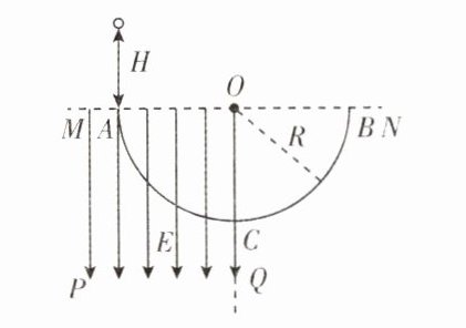 9. [黑龙江大庆实验中学2025届阶段考]如图所示,ACB为固定的光滑半圆形竖直绝缘轨道,半径为R,AB为半圆形轨道水平直径的两个端点,OC为半圆形轨道的竖直半径,AC为$\frac{1}{4}$圆弧,OC的左侧、OA的下方区域MPQO有竖直向下的匀强电场. 一个带负电的小球,从A点正上方高为H处由静止释放,并从A点沿切线进入半圆形轨道. 不计空气阻力,小球所带电荷量不变. 关于带电小球的运动情况,下列说法正确的有 ( )