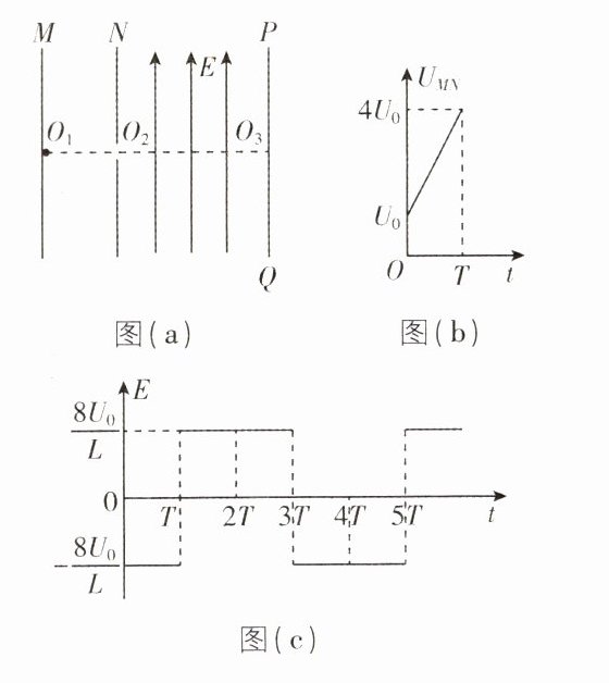 (3)若N和PQ间的偏转电场为图(c)所示的周期性变化电场,取平行PQ向下为正方向,从t = 0时刻释放的粒子恰好打到O₃,则t = T时刻释放的粒子打到PQ上的位置.