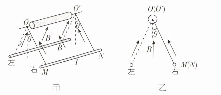3. 如图甲,直导线MN被两等长且平行的绝缘轻绳悬挂于水平轴OO'上,其所在区域存在方向垂直指向OO'的磁场,与OO'距离相等位置处的磁感应强度大小相等且不随时间变化,其截面图如图乙所示. 导线通以电流I,静止后,轻绳偏离竖直方向的夹角为θ. 下列说法正确的是( )