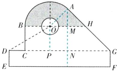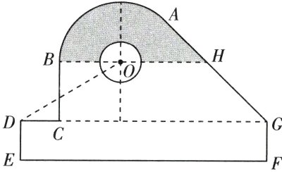 15. 某中学开展劳动实习, 学生加工制作零件, 零件 截面如图所示. O为圆孔及轮廓圆弧AB所在圆的圆心, A是圆弧AB与直线AG的切点,B是圆弧AB与直线BC的切点, 四边形DEFG为矩形, BC⊥DG, 垂足为C, tan∠ODC = $\frac{3}{5}$, BH//DG, EF = 12cm,