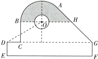 16. 某中学开展劳动实习,学生加工制作零件,零件的截面如图所示。O为圆孔及轮廓圆弧AB所在圆的圆心,A是圆弧AB与直线AG的切点,B是圆弧AB与直线BC的切点,四边形DEFG为矩形,BC⊥DG,垂足为C,tan∠ODC = $\frac{3}{5}$,BH//DG,EF = 12cm,DE = 2cm,A到直线DE和EF的距离均为7cm,圆孔半径为1cm,则图中阴影部分的面积为________cm².