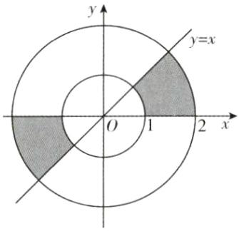 [深度解析]由题意可知区域$\{(x,y)|1\leq x^2 + y^2\leq4\}$表示如图所示的圆环,其面积$S = 4\pi - \pi = 3\pi$。其中满足直线$OA$的倾斜角不大于$\frac{\pi}{4}$的点$A$所在区域如图中阴影部分所示
